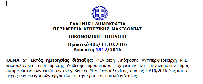 ΘΕΜΑ 5ο Εκτός ημερησίας διάταξης: «Έγκριση Απόφασης Αντιπεριφερειάρχη Μ.Ε. Θεσσαλονίκης περί άμεσης διάθεσης προσωπικού, οχημάτων και μηχανημάτων προς αντιμετώπιση των εκτάκτων αναγκών της Μ.Ε. Θεσσαλονίκης, από τις 10/10/2016 έως και το πέρας των επειγουσών εργασιών και την άρση της επικινδυνότητας»